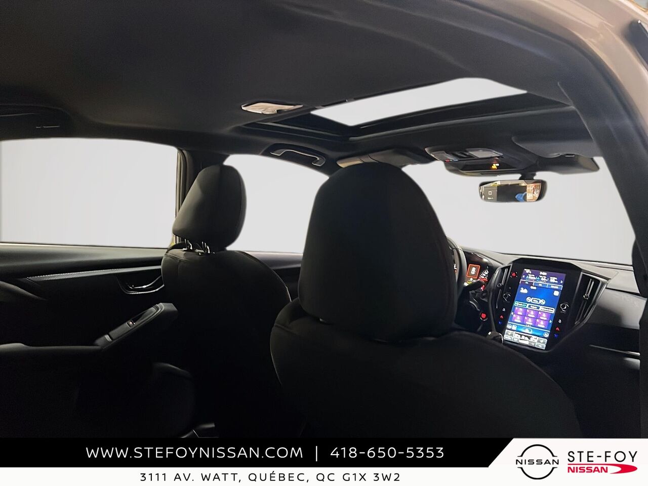 transmission : subaru de performance -comprend : distribution variable du couple, affichage du rapport engagé, convertisseur de couple à blocage, refroidisseur d'huile de la transmission à variation continue, mode manuel de passage des vitesses avec palette de changement de vitesse, système si-drive (3 modes), dispositif de verrouillage de la transmission et mode manuel à 8 vitesses, ensemble eyesight, affichage de surveillance eyesight, technologie d'aide à la conduite, système de freinage précollision, système de braquage automatique d'urgence et gestion du papillon des gaz précollision, régulateur de vitesse adaptatif, immobilisation du véhicule en pente, système de suivi de voie et alerte de déviation de trajectoire, maintien au centre de la voie, alerte de départ du véhicule de tête, freinage automatique en marche arrière, frein de stationnement électronique, activation à bouton-poussoir, climatisation à distance, démarrage et arrêt du moteur à distance, rétroviseur intérieur à atténuation automatique avec homelink et boussole
